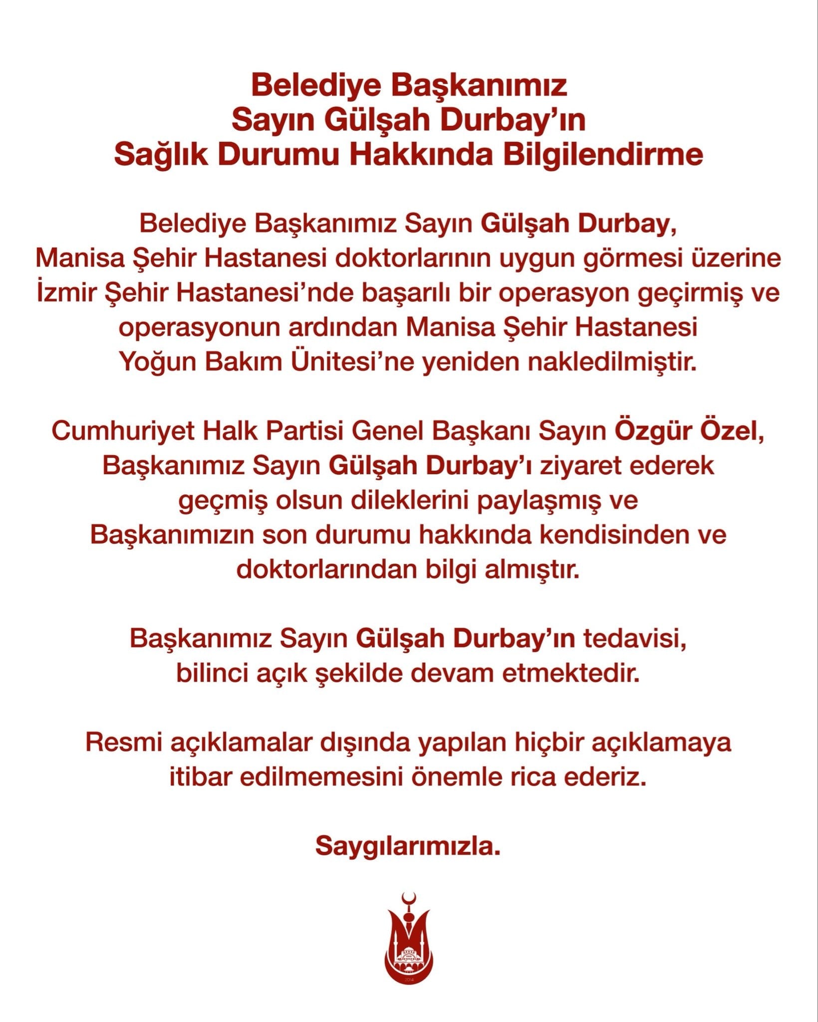 Şehzadeler Belediyesi, kamuoyuna yaptığı bilgilendirmede Başkan Durbay’ın sağlık durumunun stabil olduğunu belirterek şu ifadeleri paylaştı: